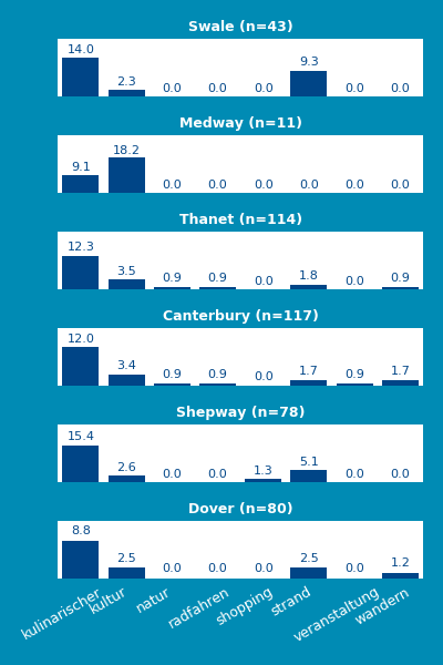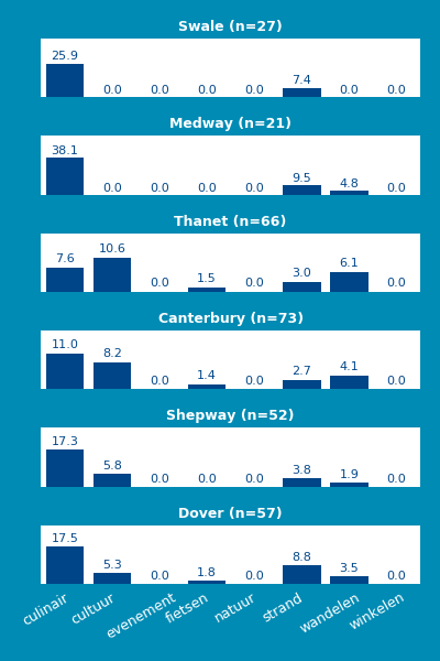 Guests don’t just write their opinion about the company in question in their reviews, but often also about the activities which have been undertaken in the region. This will provide information about why guests visit a certain destination. This analysis looks at the subjects which guests write about and specifically at subjects which aren’t about the company itself, but mainly about the activities which guests have participated with. We found these subjects through the use of ‘concepts’. These concepts are a collection of words applicable to a certain activity. For example, for the ‘cycling’ concept, we will look at words like ‘cycling’, ‘bicycle’, ‘cyclist’ and ‘bicycle route’. This diagram shows which percentage of all reviews mentions a certain concept, and therefore also an activity. This exercise also compares different destinations in this region.