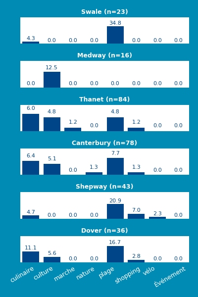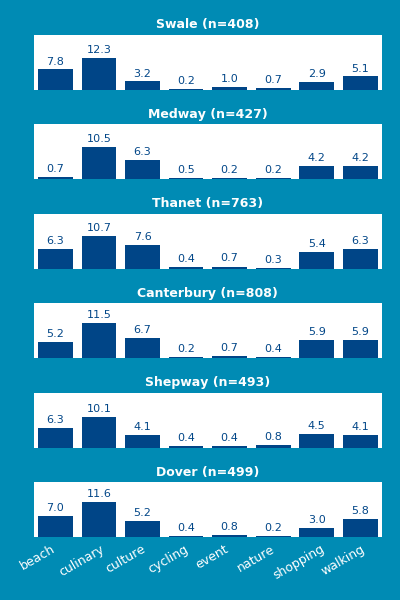 Guests don’t just write their opinion about the company in question in their reviews, but often also about the activities which have been undertaken in the region. This will provide information about why guests visit a certain destination. This analysis looks at the subjects which guests write about and specifically at subjects which aren’t about the company itself, but mainly about the activities which guests have participated with. We found these subjects through the use of ‘concepts’. These concepts are a collection of words applicable to a certain activity. For example, for the ‘cycling’ concept, we will look at words like ‘cycling’, ‘bicycle’, ‘cyclist’ and ‘bicycle route’. This diagram shows which percentage of all reviews mentions a certain concept, and therefore also an activity. This exercise also compares different destinations in this region.