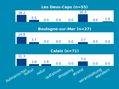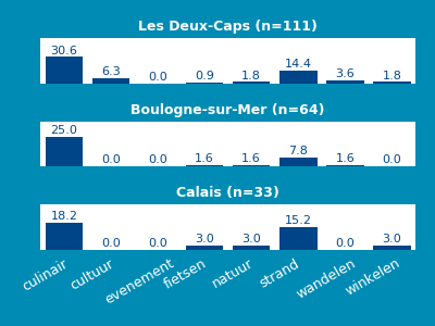 Dans leurs évaluations, les clients écrivent non seulement leur opinion sur l'entreprise, mais aussi, dans de nombreux cas, sur les activités qu’ils ont effectuées dans la région. On en tire des informations sur les raisons pour lesquelles les clients se rendent à dans une destination. Nous avons défini des thèmes à partir des mots les plus cités. Ainsi, il existe le thème « cyclisme » dans lequel nous retrouvons des mots tels que « rouler à vélo », « vélo », « cycliste » et « route cyclable ». Un diagramme montre dans quelle proportion, un thème et donc une activité, a été mentionné. Cette méthode permet de comparer les trois territoires de la destination.