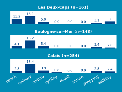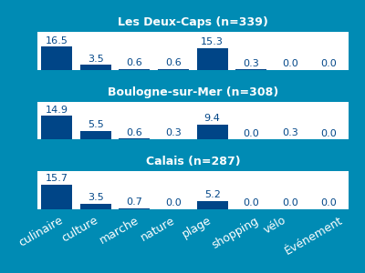 Dans leurs évaluations, les clients écrivent non seulement leur opinion sur l'entreprise, mais aussi, dans de nombreux cas, sur les activités qu’ils ont effectuées dans la région. On en tire des informations sur les raisons pour lesquelles les clients se rendent à dans une destination. Nous avons défini des thèmes à partir des mots les plus cités. Ainsi, il existe le thème « cyclisme » dans lequel nous retrouvons des mots tels que « rouler à vélo », « vélo », « cycliste » et « route cyclable ». Un diagramme montre dans quelle proportion, un thème et donc une activité, a été mentionné. Cette méthode permet de comparer les trois territoires de la destination.