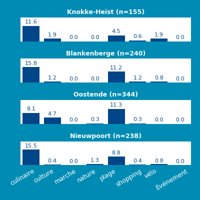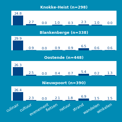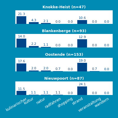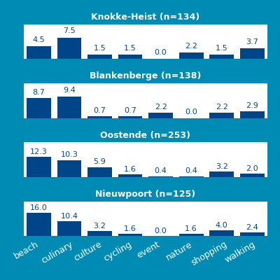 Gasten schrijven in hun reviews niet alleen hun mening over het betreffende bedrijf, maar in veel gevallen ook over activiteiten die in de regio zijn ondernomen. Dit geeft informatie over waarom gasten naar een bestemming komen. In deze analyse is gekeken naar de onderwerpen waar gasten over schrijven en dan specifiek naar onderwerpen die niet zozeer over het bedrijf zelf gaan, maar vooral over de activiteiten die gasten hebben ondernomen. Deze onderwerpen hebben we gevonden door middel van ‘concepten’. Zo’n concept is een verzameling van woorden die over een bepaalde activiteit gaan. Zo is er het concept ‘fietsen’ waarin we o.a. kijken naar woorden als ‘fietsen’, ‘fiets’, ‘fietser’ en ‘fietsroute’. In onderstaande diagrammen wordt getoond in welk percentage van alle reviews een bepaald concept, en daarmee dus een activiteit, is genoemd. Daarbij worden verschillende bestemmingen in deze regio met elkaar vergeleken. 'N' staat hierbij voor het aantal reviews waarop de analyse gebaseerd is.